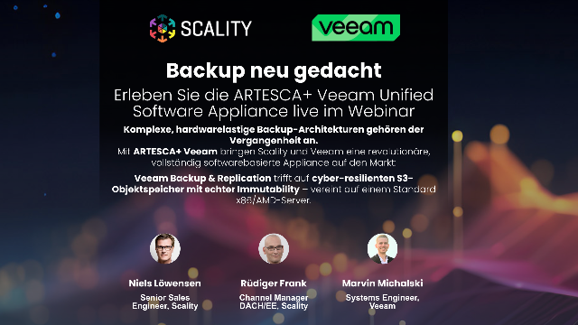 Live-Webinar: Entdecken Sie unsere Lösung! Erleben Sie in unserem Live-Webinar, wie ARTESCA+ Veeam Ihre Backup- und Wiederherstellungsprozesse ...more