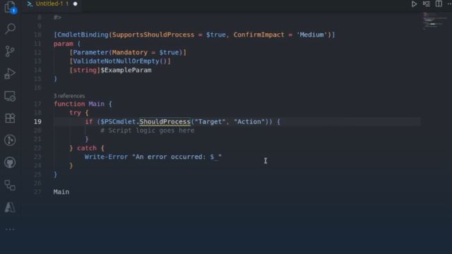 - Seed with a descriptive comment or a minimal function skeleton -- CmdletBinding, parameters, try/catch, ShouldProcess. GitHub Copilot will propose completions that follow your intent and style.